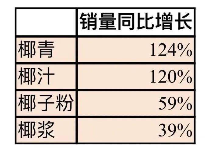 近年來,椰汁類飲品在零售消費市場廣受歡迎,行情十分火熱。數據顯示,進入2021年天貓雙11飲品賽道TOP30的植物奶品牌中,主打椰子口味的品牌占比超過1/3,充分說明了椰子滲透到各細分品類中;而據京東消費大數據,近兩年海南椰制品的線上消費增長速度領跑全國,2021年海南椰制品線上成交額同比增長133.2%,遠超全國平均增速,其中直接飲用的椰青、椰汁的銷量同比增長超過120%,用于制作椰汁的椰子粉、椰漿的銷量分別同比增長59%與39%,火爆程度可見一斑。