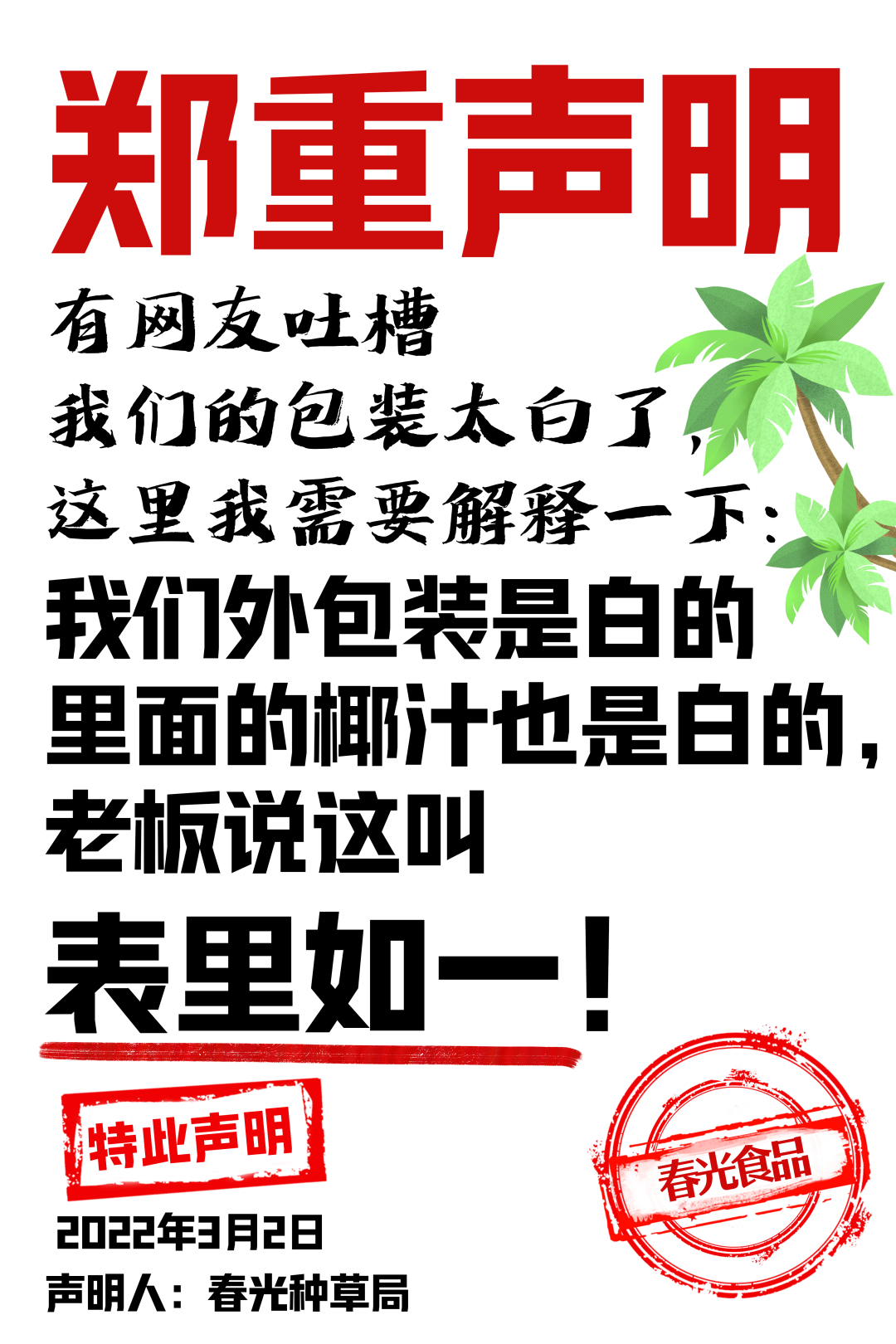 春光食品洞察到消費者對新鮮椰汁產品的需求,秉承把海南島的椰子產品賣到世界各地的初心,打造了“春光椰汁”新品。以“新鮮口感、保留椰汁本來的味道”為核心主張,從原材料到生產工藝,全方位回應了消費者對“新鮮”“營養”椰汁的訴求。